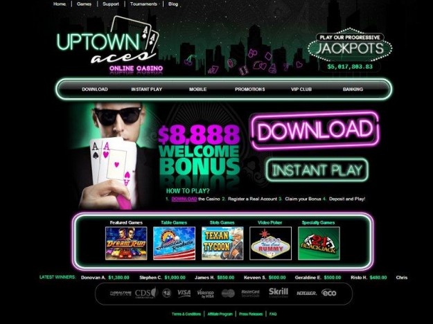 Uptown Aces online casino offers new players match bonuses of up to $8,888 in total on their first 6 deposits. Other bonus offers and promotions, including weekly bonus offers, are available as well. The casino has a comp points system that lets players earn points for every dollar wagered on eligible games. The average payout for games at Uptown Aces is of 96.80%. US players can choose from a variety of payment options including Visa and MasterCard credit cards, plus person-to-person money transfers.